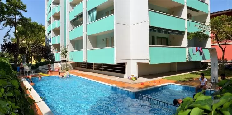 Négyemeletes modern apartmanház a főutca és a tengerpart között, Bibione Spiaggia központjában. Kitűnő megoldás gyermekes családok számára is és mindenkinek, aki szereti, ha rövid sétatávolságra található minden (üzletek, éttermek stb.)
