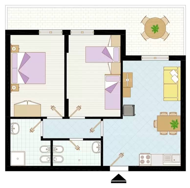 HÁROM LÉGTERŰ 4-6 fő részére: nappali kétszemélyes kanapéval, szoba franciaággyal, szoba két egyszemélyes ággyal vagy emeletes ággyal, főzőfülke, 2 fürdőszoba, erkély. Légkondicionálás.