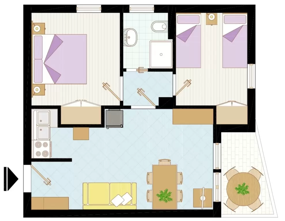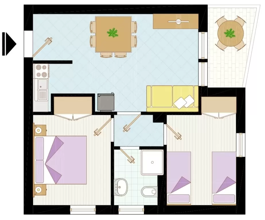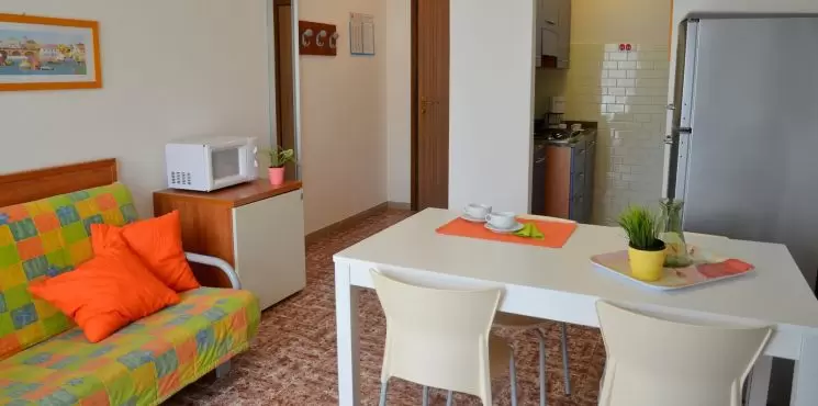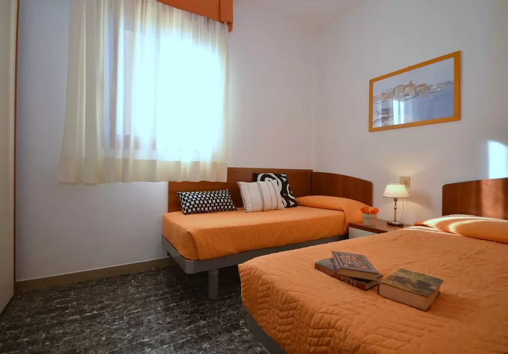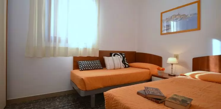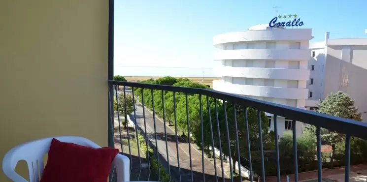 HÁROM LÉGTERŰ 4-6 fő részére: nappali kétszemélyes kanapéval, 2 kétágyas szoba, főzősarok, fürdőszoba, erkély tengerre néző kilátással Légkondicionálás.