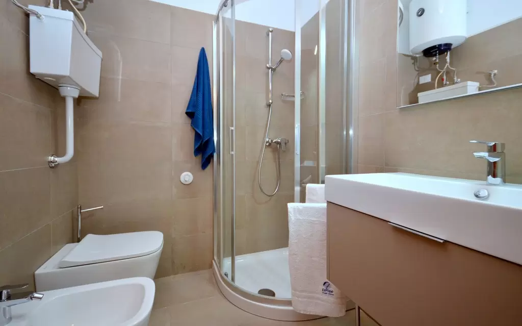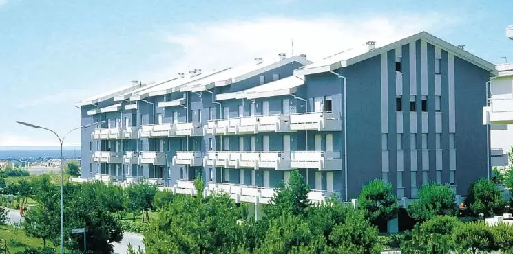 Tengerparti fekvésű apartmanház zöld és nyugodt környezetben, pár lépésre a központtól, három emeleten, két lifttel, foglalt parkolóhelyekkel, közös kerttel.
