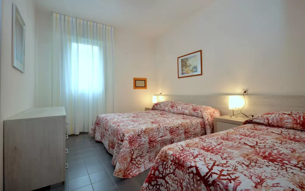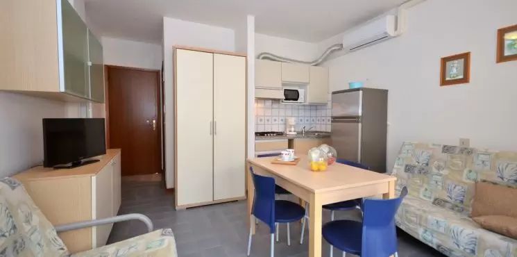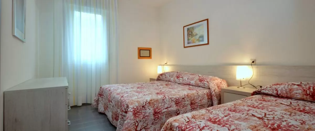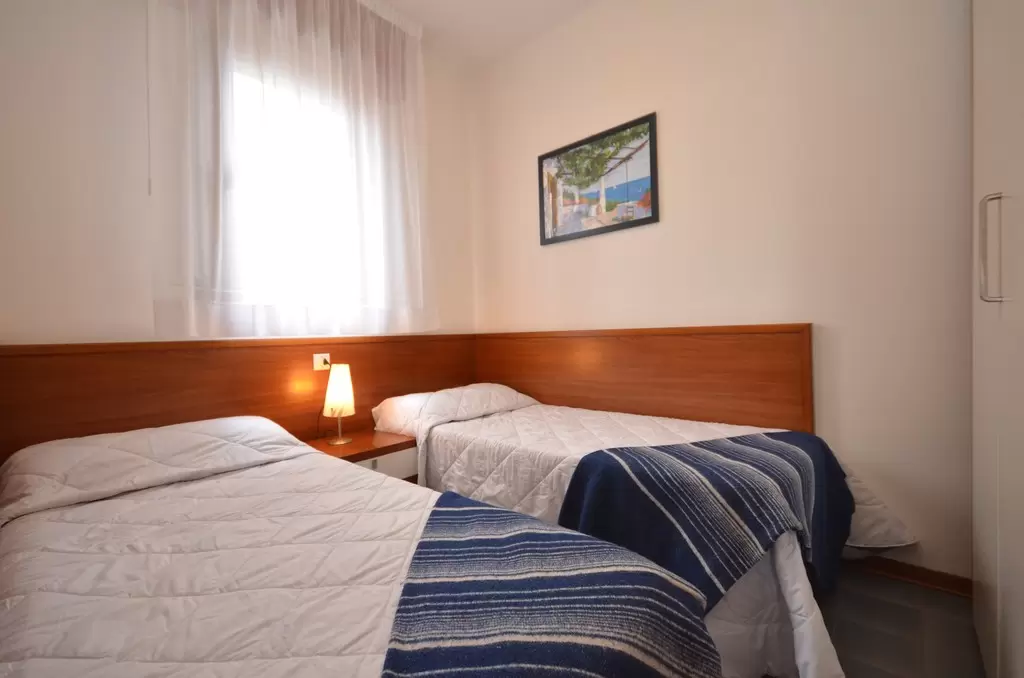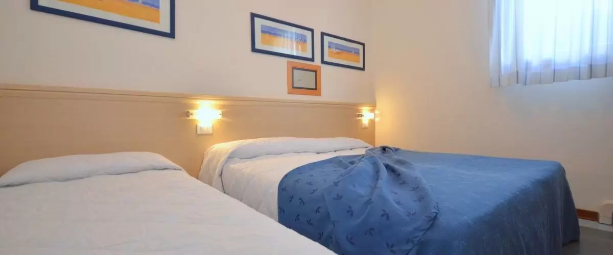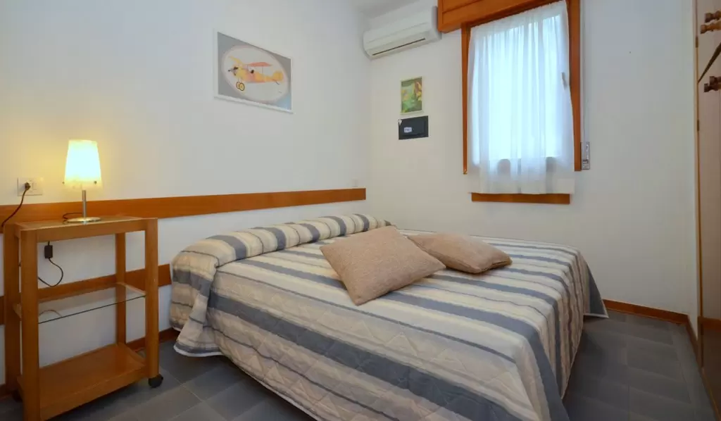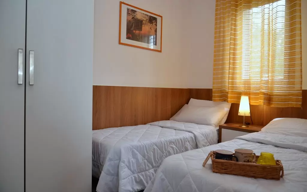 HÁROM LÉGTERŰ 3-5 fő részére légkondicionálással és mosógéppel: nappali, 1 szoba emeletes ággyal é 1 egyszemélyes ággyal, 1 szoba kétszemélyes kanapéval, főzősarok, fürdőszoba, terasz. Széf nélkül.