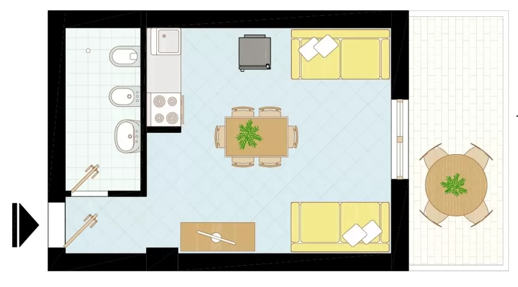 EGY LÉGTERŰ, teljesen felújított, légkondicionálóval 2 fő részére: nappali kétszemélyes kanapéval, főzősarok, fürdőszoba, terasz.