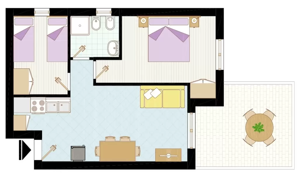 HÁROM LÉGTERŰ 5-7 fő részére: nappali kétszemélyes kanapéval, 1 kétágyas szoba, 1 háromágyas szoba, főzősarok, fürdőszoba, terasz, légkondicionálás.