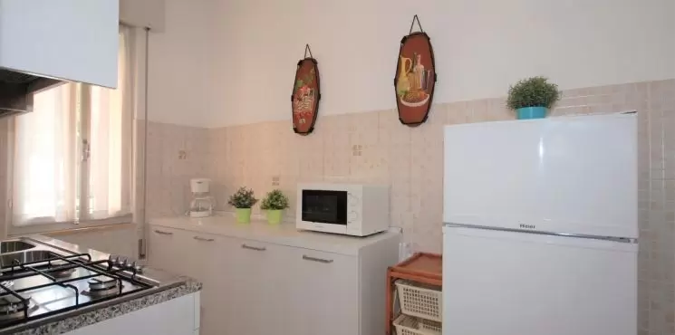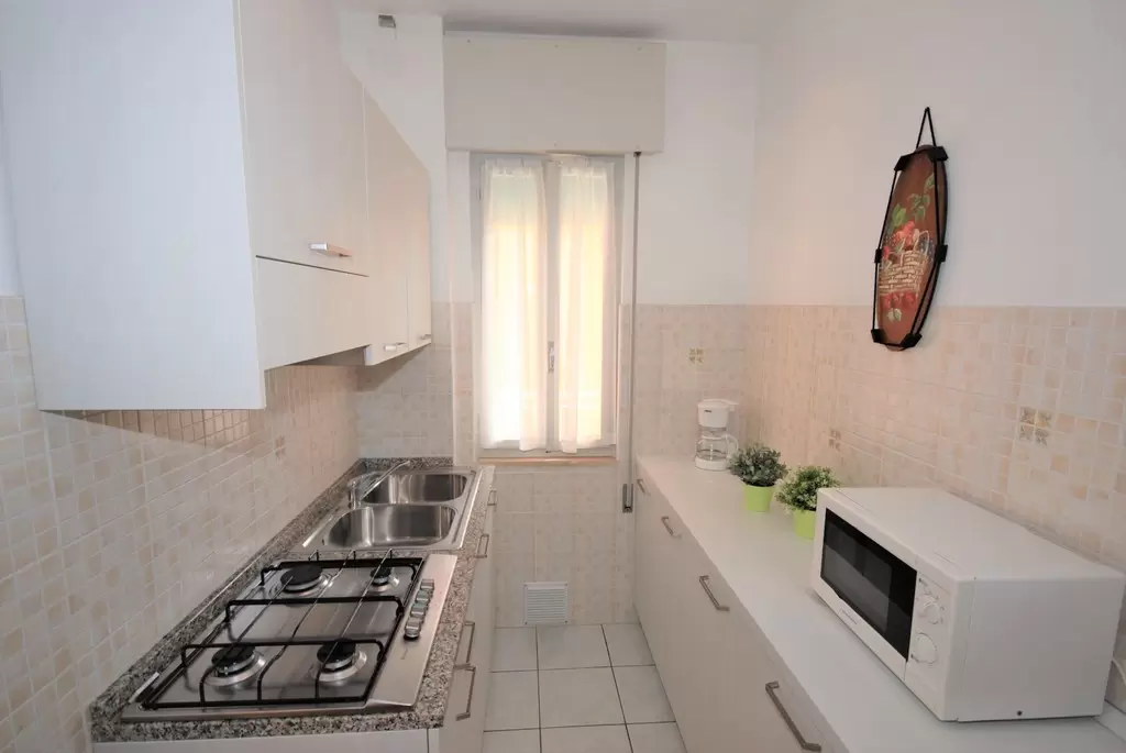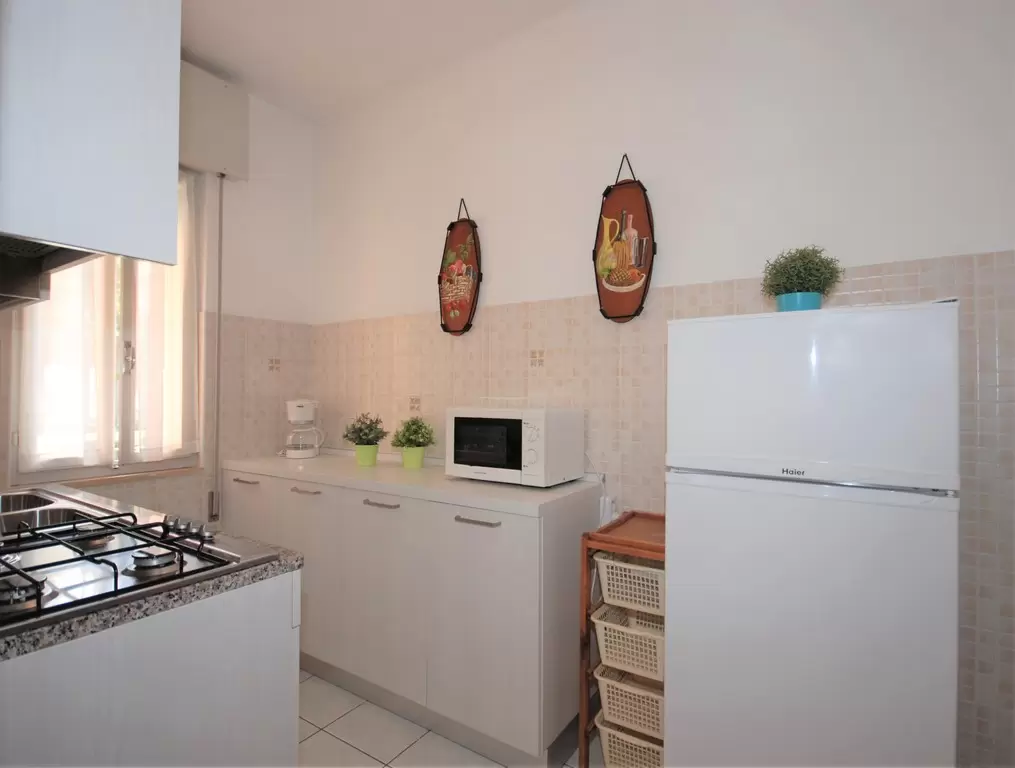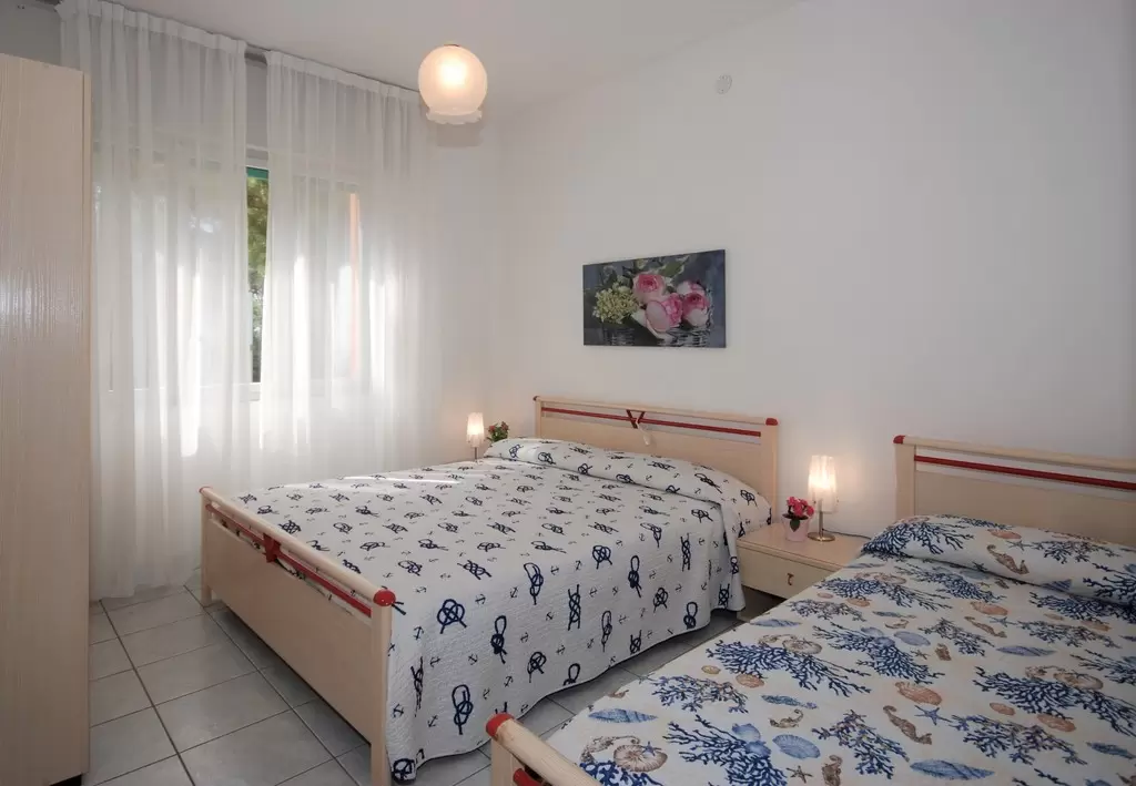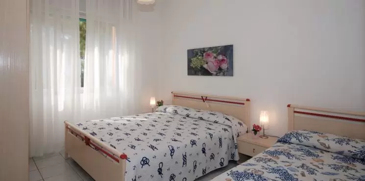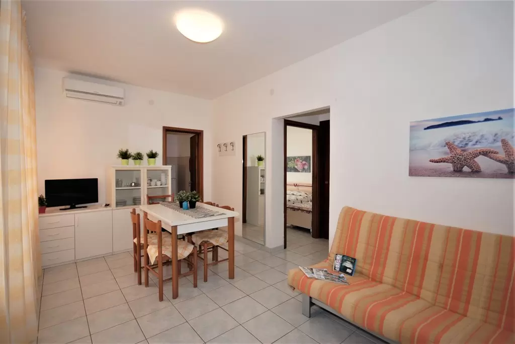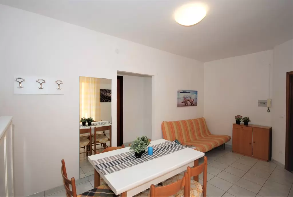 B-5 főre: nappali kétszemélyes kanapéval, konyhasarok, 1 hálószoba franciaággyal és 1ággyal, fürdőszoba, kicsi erkély. Tv, mikró, légkondicionálás, mosógép.