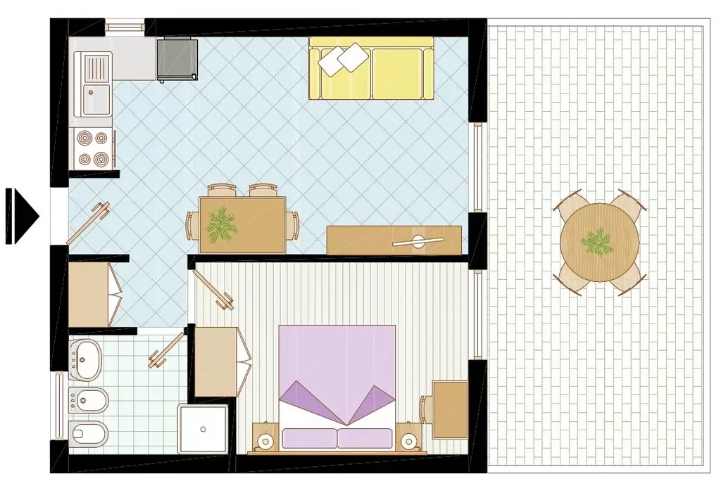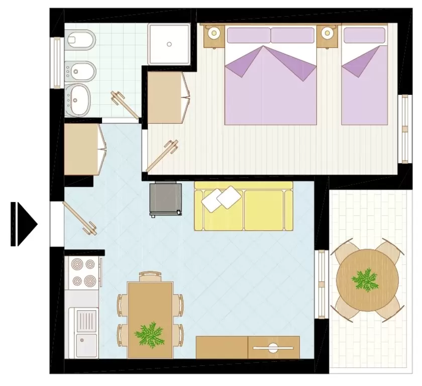 B-4 főre: nappali kétszemélyes kanapéval, konyhasarok, hálószoba 2 ággyal, fürdőszoba, erkély. Tv, széf, mikró, légkondicionálás.