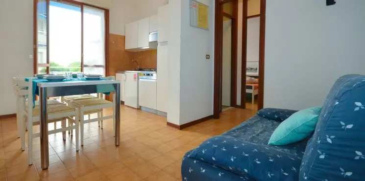 KÉT LÉGTERŰ 3-5 fő részére: nappali kétszemélyes kanapéval, 1 szoba franciaággyal és 1 egyszemélyes ággyal, főzősarok, fürdőszoba, terasz.