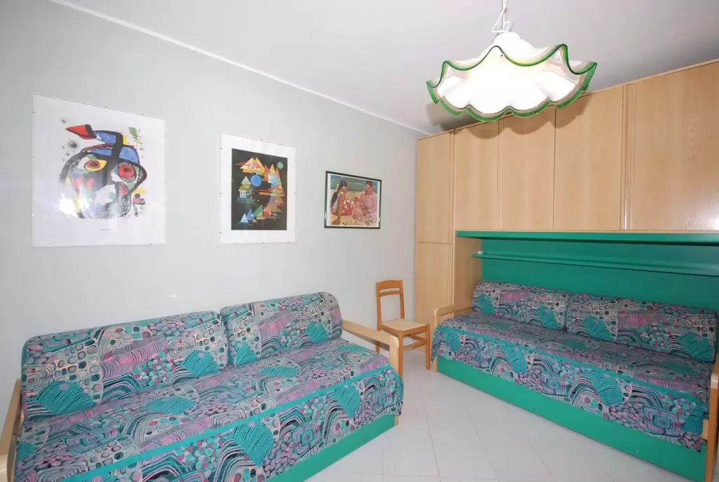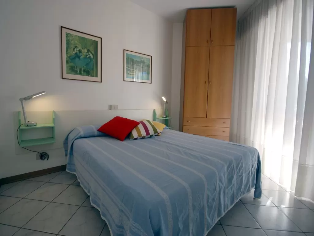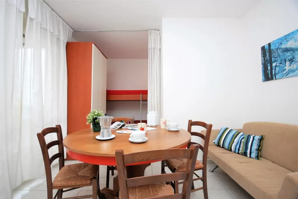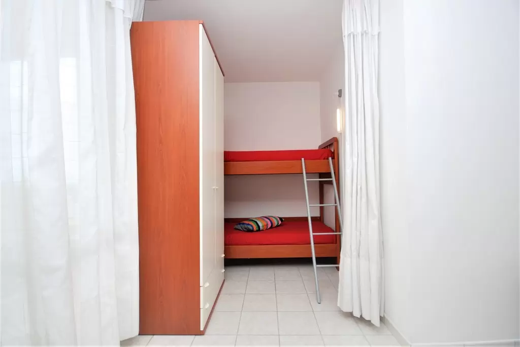 TWO-ROOM-APARTMENT for 2-5 persons composed of: living-room with double divan-bed and single pull-out bed or divan for 1 person and bunk bed, 1 bedroom with double bed, kitchen corner, bathroom, balcony.