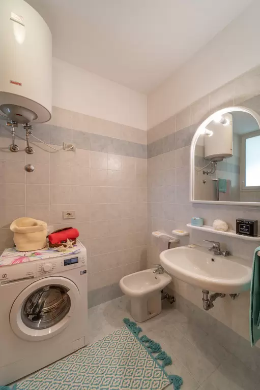 HÁROM LÉGTERŰ légkondicionált 4-6 fő részére a 2. emeleten: nappali kétszemélyes kanapéval, 1 szoba franciaággyal, 1 szoba 2 egyszemélyes ággyal vagy emeletes ággyal, főzősarok, fürdőszoba, fedett tetőterasz. Mosógép.