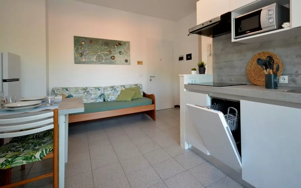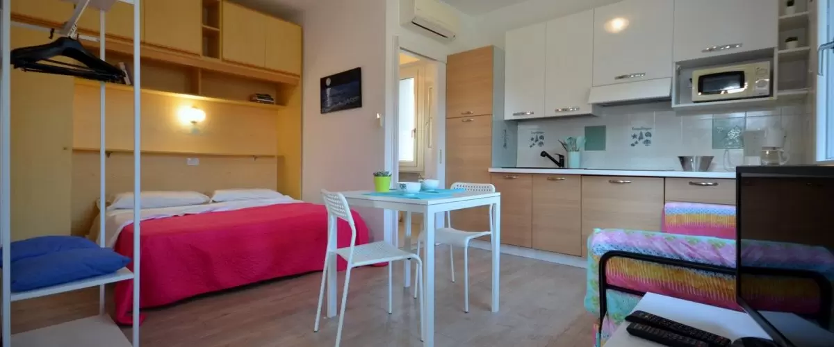 EGYLÉGTERŰ 2 fő részére: nappali, hálófülke franciaággyal, főzősarok, mosogep, fürdőszoba, kis terasz.
