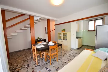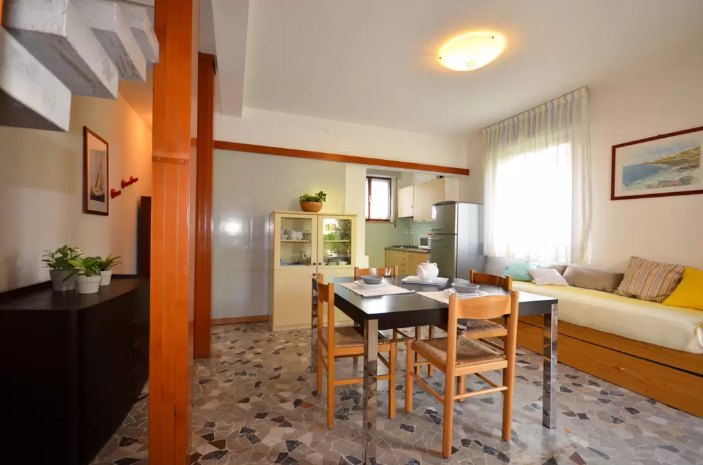 NÉGY LÉGTERŰ 6-8 fő részére, két szinten; Földszinten : nappali kétszemélyes kanapéval, kis konyha, fürdőszoba zuhanyfülkével, terasz, tágas privát kert; Első emeleten : 1 szoba franciaággyal, 1 kétágyas szoba, 1 emleetes ágyas szoba, fürdőszoba zuhanyfülkével. Air-conditioning.