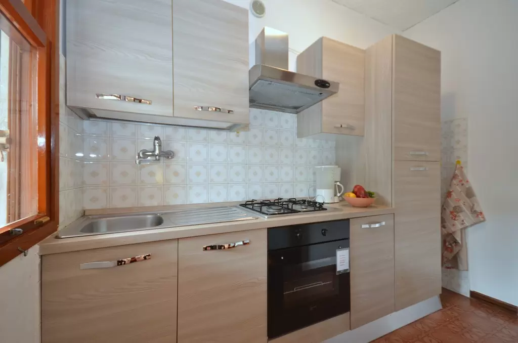 NÉGY LÉGETRŰ 5-7 fő részére két szinten, a földszinten: garázs. Az első emelen: nappali kétszemélyes kanapéval, konyha, 2 franciaágyas szoba, 1 egyágyas szoba, ablakos fürdőszoba, erkély, tűzrakóhely. Zárt kert. Részben felújított. Légkondicionálás.