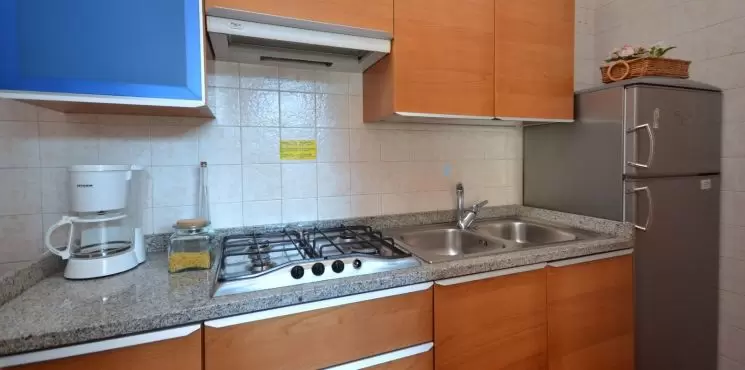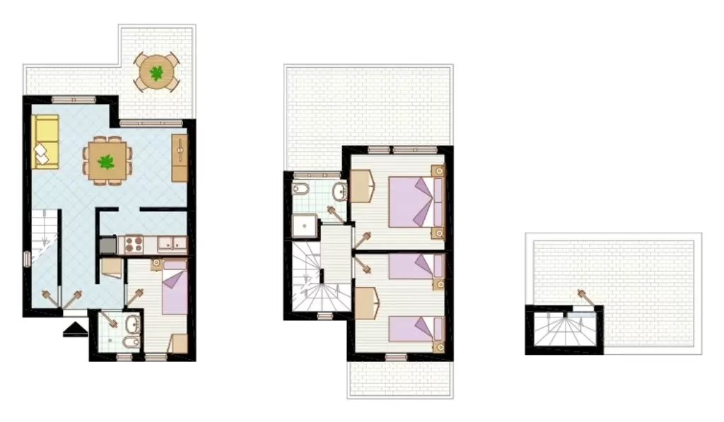 NÉGY LÉGTERŰ, 3 szinten 6-8 fő részére; Földszinten nappali dupla dívánnyal, kis konyha, szoba emeletes ággyal, fürdőszoba, fedett terasz. Első emeleten: 1 szoba franciaággyal és terasszal, 1 kétágyas szoba terasszal, fürdőszoba. Második emeleten: napozóterasz. Légkondicionálás.