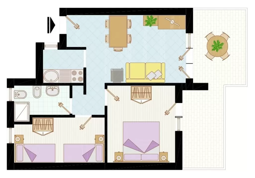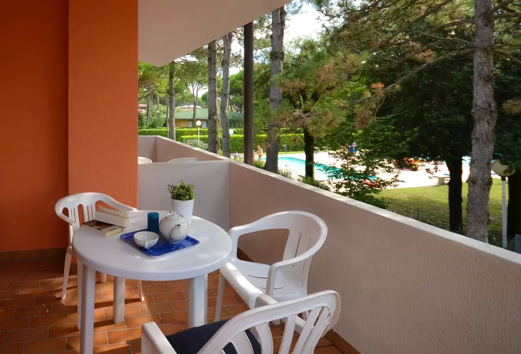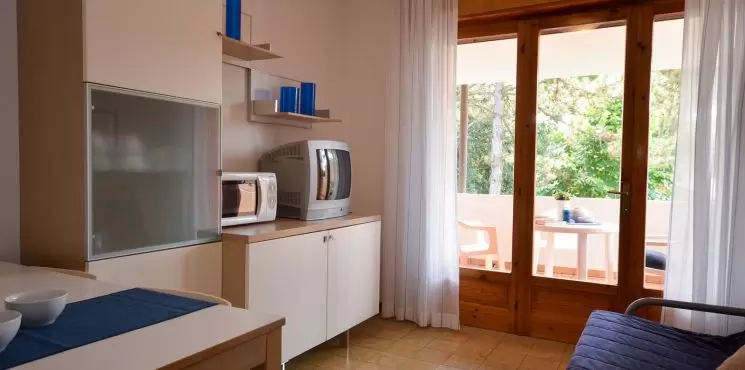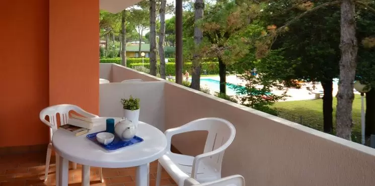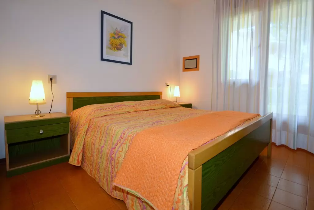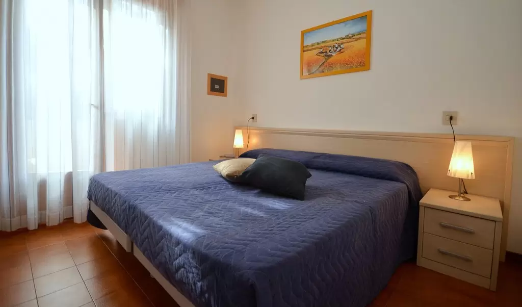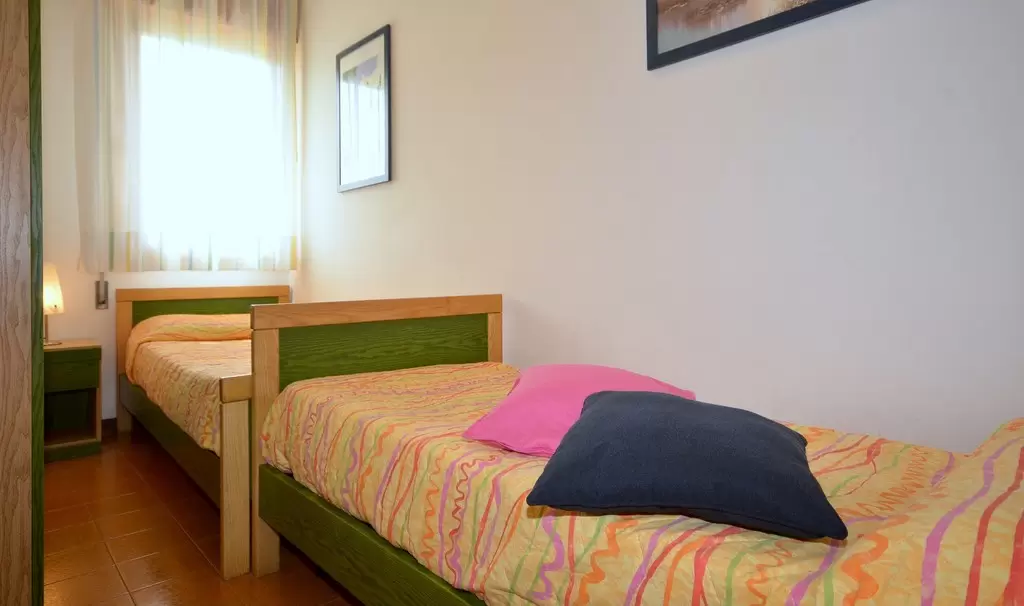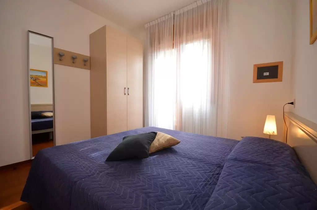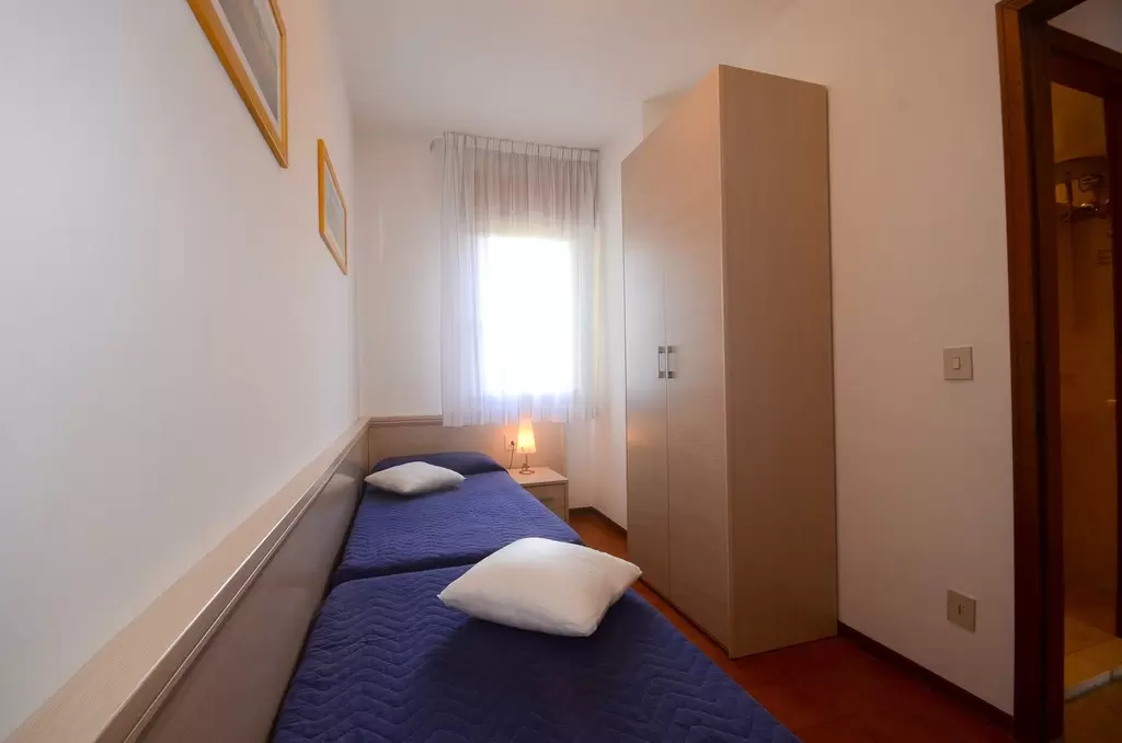 HÁROM LÉGTERŰ első emeleten 4-6 fő részére: nappali kétszemélyes kanapéval, 2 kétágyas szoba, főzősarok, fürdőszoba, terasz. Légkondicionálás.