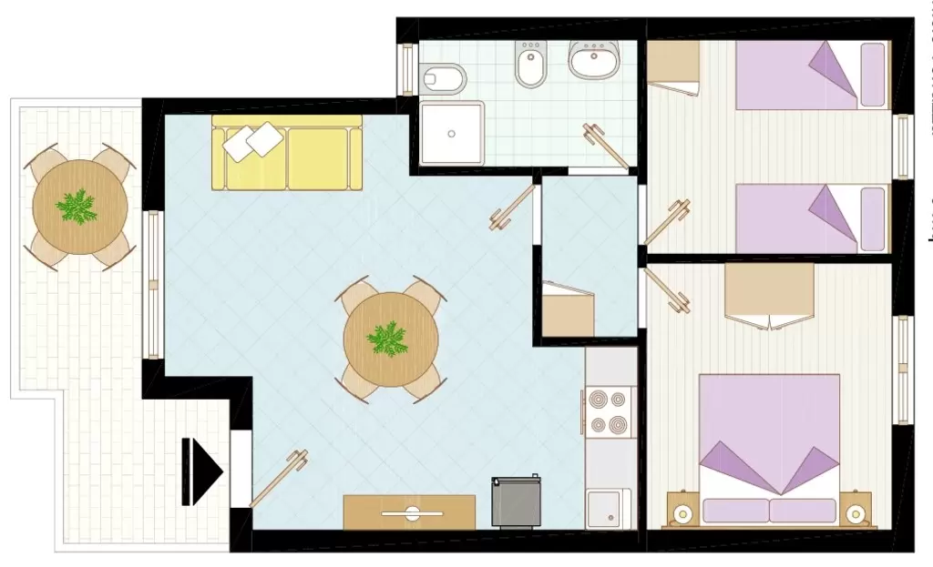 HÁROM LÉGTERŰ első emeleti 4-6 fő részére: nappali kétszemélyes kanapéval, szoba franciaággyal, kétágyas vagy emeletes ágyas szoba, főzősarok, fürdőszoba, terasz. Légkondicionálás.